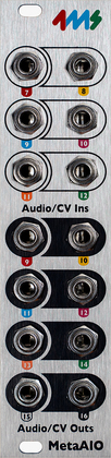 The MetaModule Audio Expander (MetaAIO) adds an additional 6 CV/Audio inputs and 8 CV/Audio outputs to your MetaModule patches, via a ribbon cable connected to the main MetaModule. The MetaAIO provides the same high-quality as the MetaModule's Audio/CV jacks (24-bit, 48kHz default, up to 96kHz).