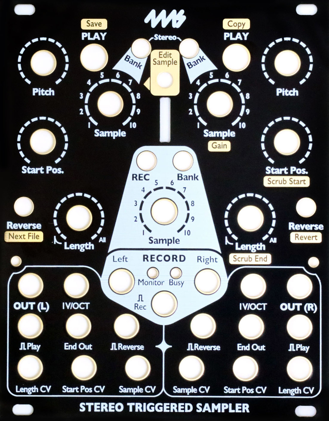 DIY replacement faceplate for the Stereo Triggered Sampler. Black background with white artwork.