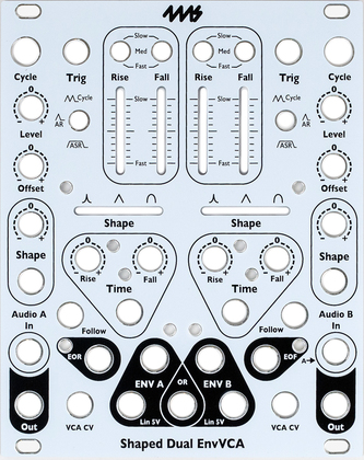The Shaped Dual EnvVCA is a two-channel analog envelope generator with waveshapers and a stereo linear VCA. Unlike conventional analog envelope modules, the waveform of each envelope can be controlled with a slider or CV without changing the envelope timing. With a wide time range from an hour to 2.5kHz, and a plethora of CV inputs and attenuverters, it can be used as an LFO, audio-rate oscillator, slew limiter, waveshaper, ASR/ADSR/complex EG, independent audio/CV VCA, envelope follower, sidechain processor, and general utility module. Each channel has dedicated linear outputs plus attenuverters and offset controls for the variable waveshape outputs, making it an ideal modulation source and stereo VCA.
