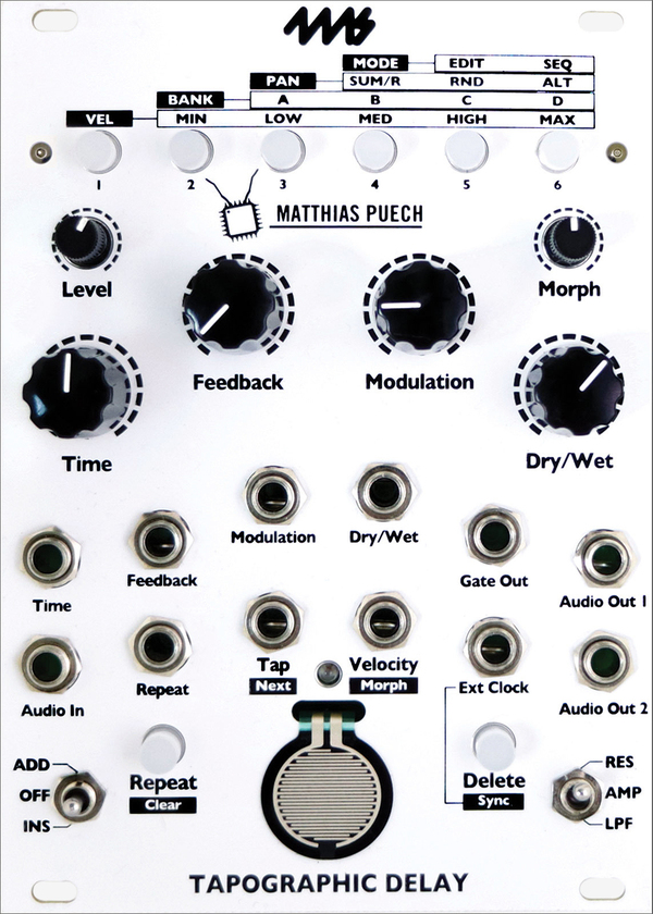 The Tapographic Delay, designed by Matthias Puech and 4ms Company, is a complex multi-tap delay in the Eurorack format with a unique interface designed for live performance. It excels at transforming the simplest audio (a drone, a percussive sound) into complex rhythmic structures, meshes of organic textures, lush harmonic mille-feuilles, liquid and resonant effects.