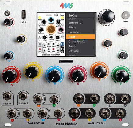 The MetaModule has 12 knobs that can be mapped to virtual knobs. Each knob can be mapped to up eight virtual knobs, and each mapping can have a different range and offset. You also can save a group of mappings as a Knob Set and switch between Knob Sets with the encoder. You also can map the 8 inputs and 8 outputs to virtual module jacks. Also, the MetaModule is a USB MIDI host, so you also can map MIDI CC, note, gate, and other parameters to knobs and jacks.