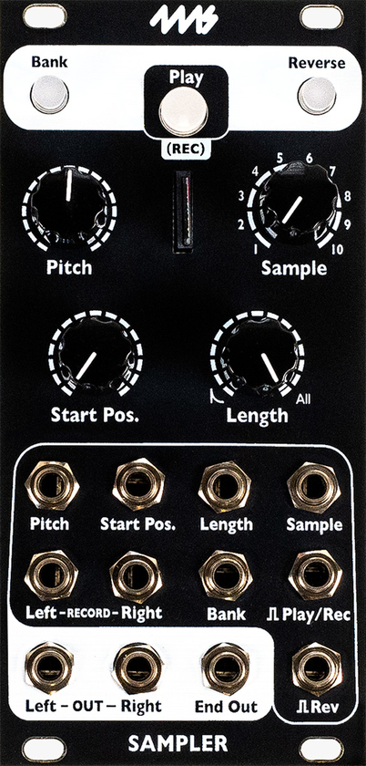 The Sampler plays stereo or mono .wav files from an SD Card with controls for Pitch (including a 1V/oct jack), Start Position, and Length.